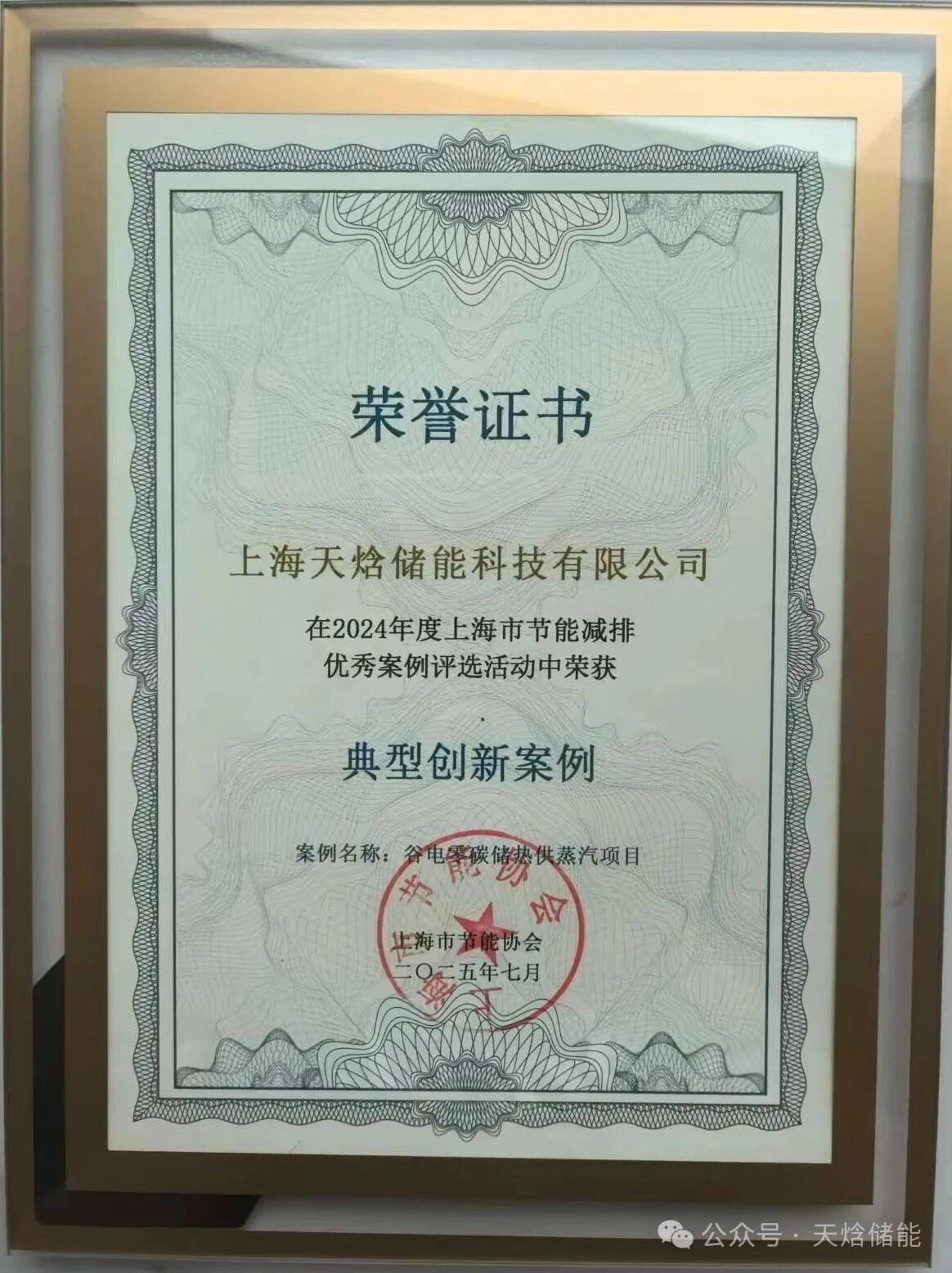 活动期间,上海市节能协会为荣获2024年度上海市节能减排优秀案例的企业举行了颁奖仪式。天焓储能的谷电零碳储热供蒸汽项目,成功入选“典型创新案例”。